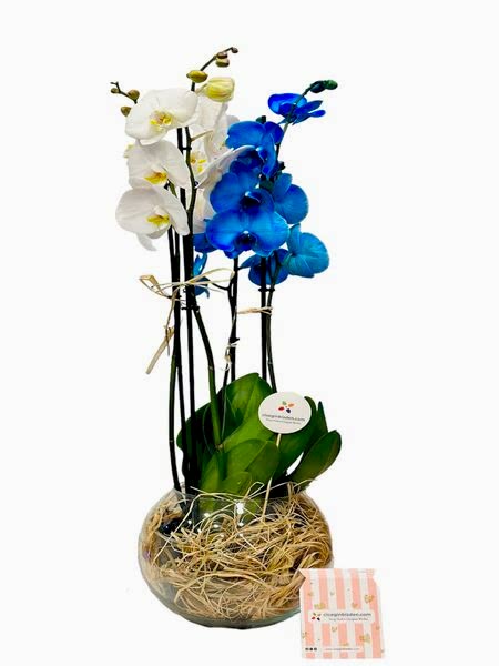Fanusta Mavi Beyaz Orkideler
